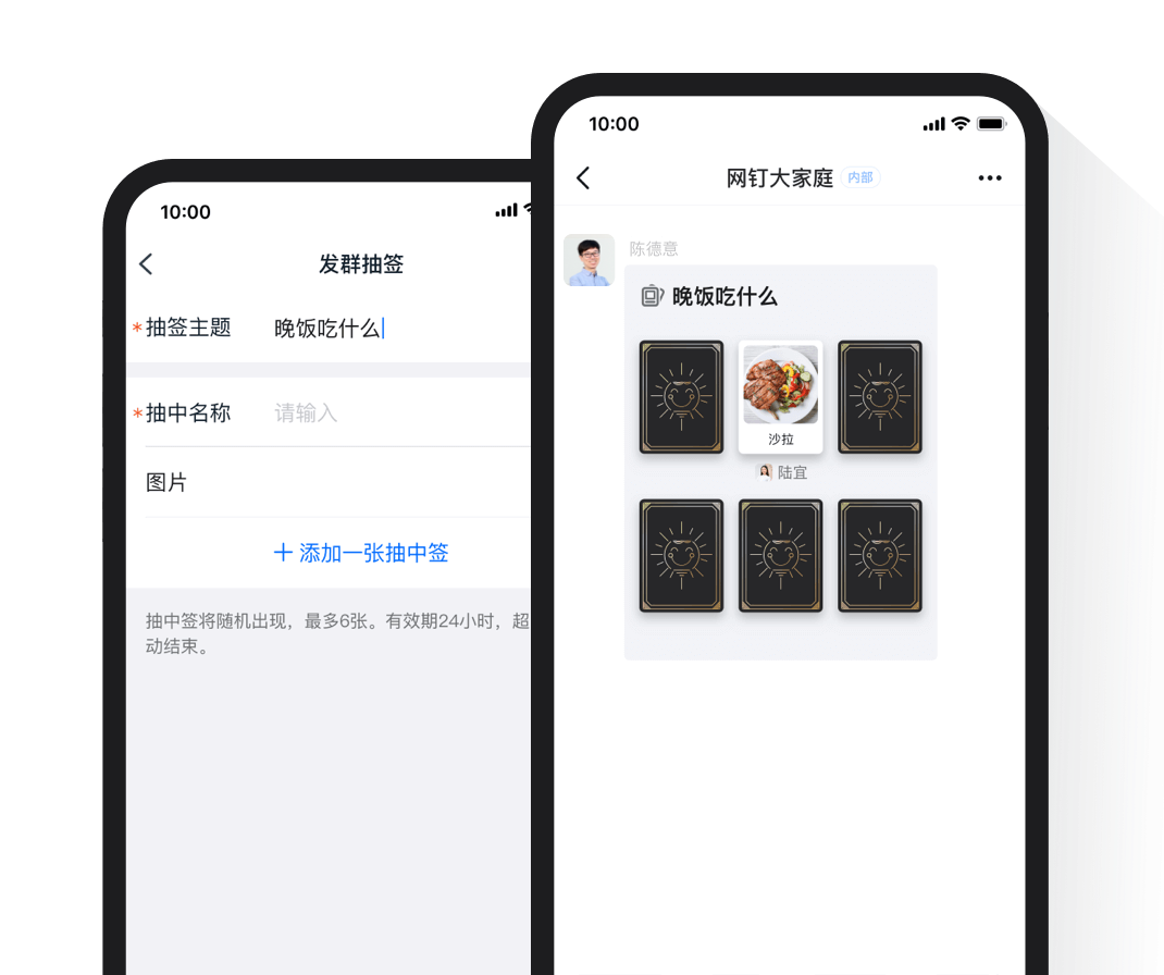 在群聊內(nèi)發(fā)出包含最多六個可抽中項目的抽簽,過程結(jié)果對所有群成員實時可見。團建抽個小獎?或者晚飯到底吃什么好?選擇困難癥,交給群抽簽。