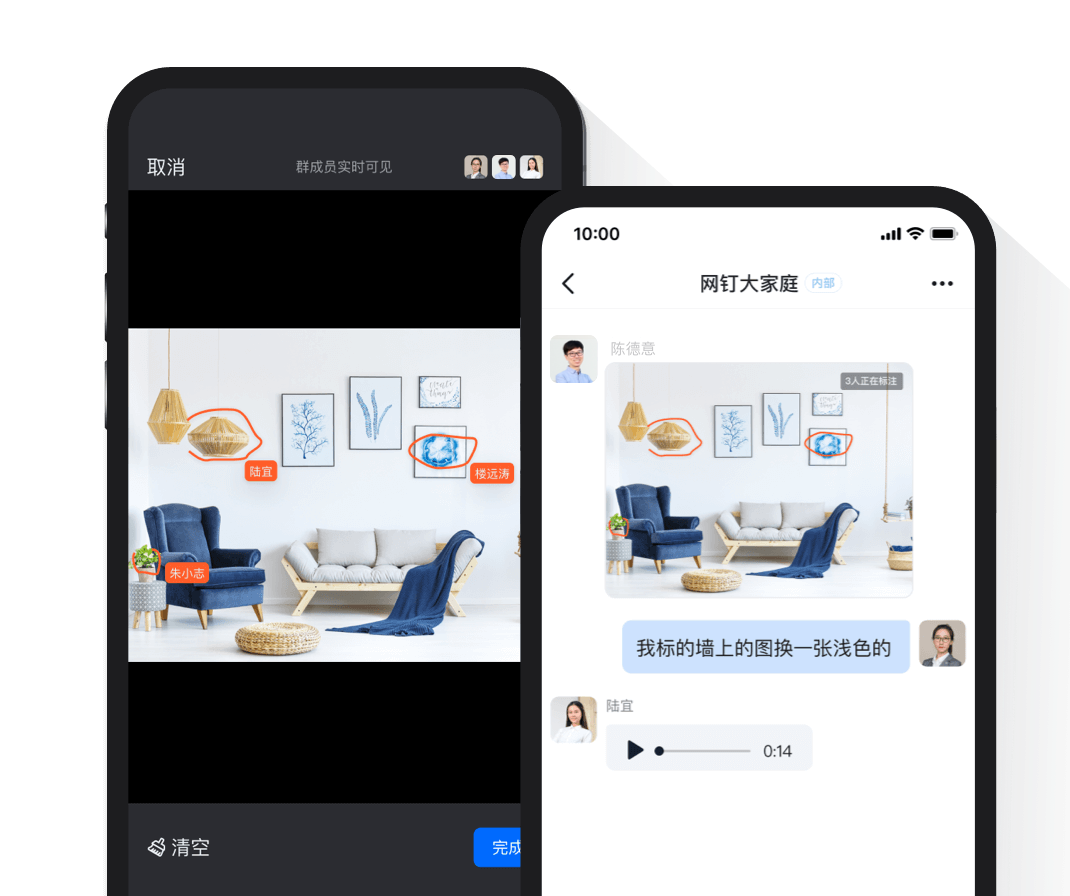 可在同一張圖片中多人實時畫線標注,標注對群成員實時可見。之前需要反復(fù)發(fā)圖溝通過程,現(xiàn)在只要一起標注即可輕松完成,見圖如見人。