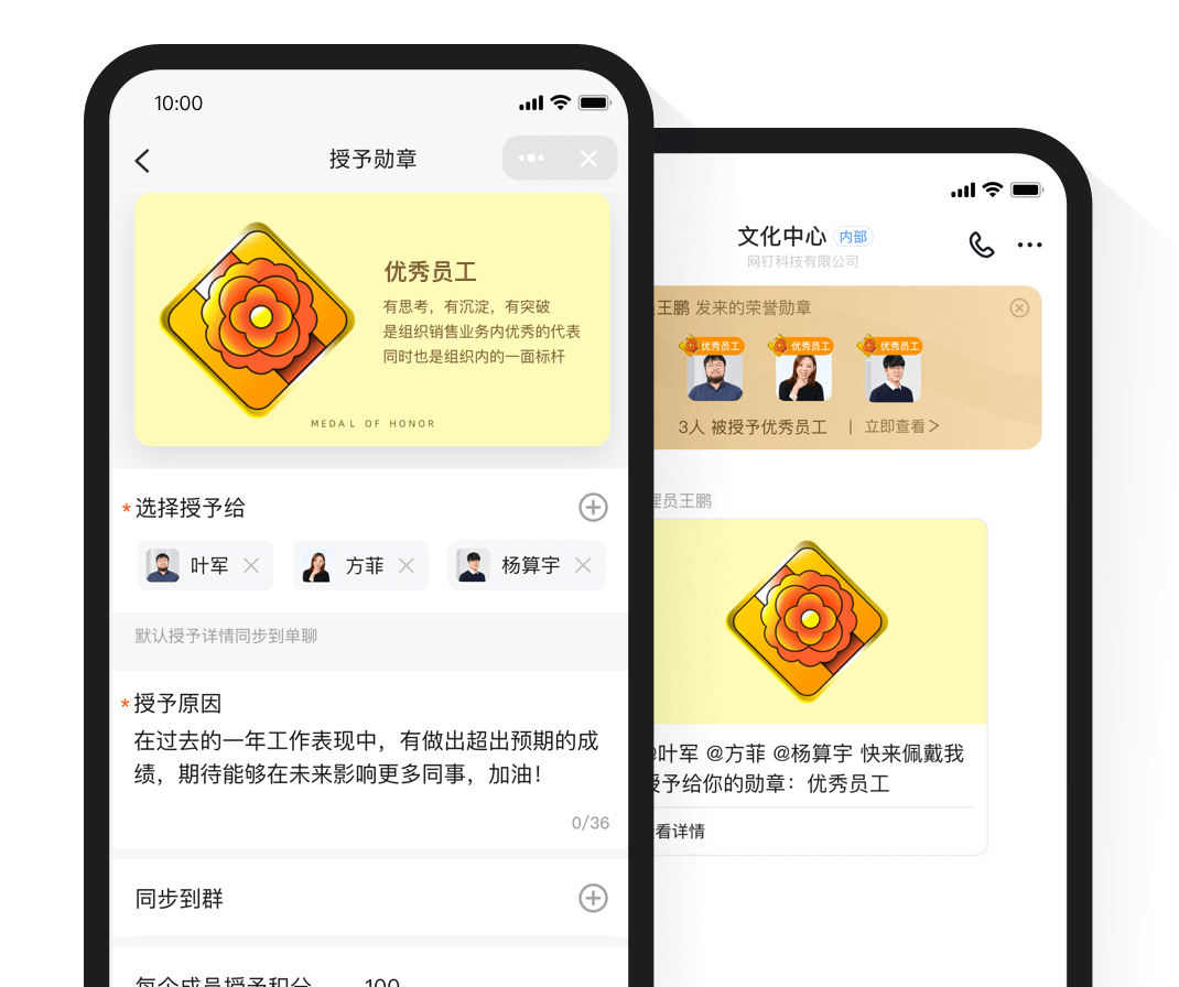 員工成長"入職一周年 團(tuán)隊(duì)杰出貢獻(xiàn)"都可設(shè)置專屬榮譽(yù)勛章發(fā)放給員工,見證員工在組織內(nèi)的成長。